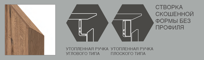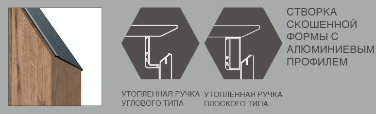 Выполнена посредством скошенного среза одного края на внутренней стороне; этот скошенный профиль отделан, как для кромки на обрезной створке либо с применением окрашенного или брашированного алюминиевого профиля.