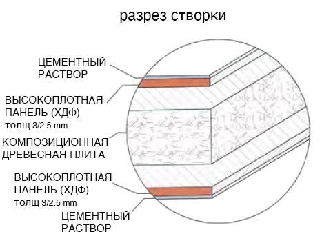 Створка толщиной 22 мм состоит из основы, сделанной из древесно-стружечной плиты, облицованной с двух сторон высокоплотными панелями HDF (класс E1), покрытыми цементным раствором, полученным путем смешения различных компонентов, гидравлических вяжущих составов и инертных материалов, на основе кварцевой муки и минеральных песков определенного гранулометрического состава, без солей и загрязняющих элементов. Во избежание того, что колебания температуры или высокие динамические нагрузки спровоцируют появление трещин или коробления, добавляется определенный процент стабилизирующих эластомерных полимерных материалов. Опытные мастера вручную наносят шпаклевку на панели, после ее просыхания на поверхность наносится несколько слоев прозрачного акрила, функцией которого является защита панели от проникновения влаги и грязи. Небольшие дырочки, неодинаковые отпечатки шпателя и неидеальные углы должны считаться не дефектами, а особенностями створки, которые подчеркивают ценность ручной работы.